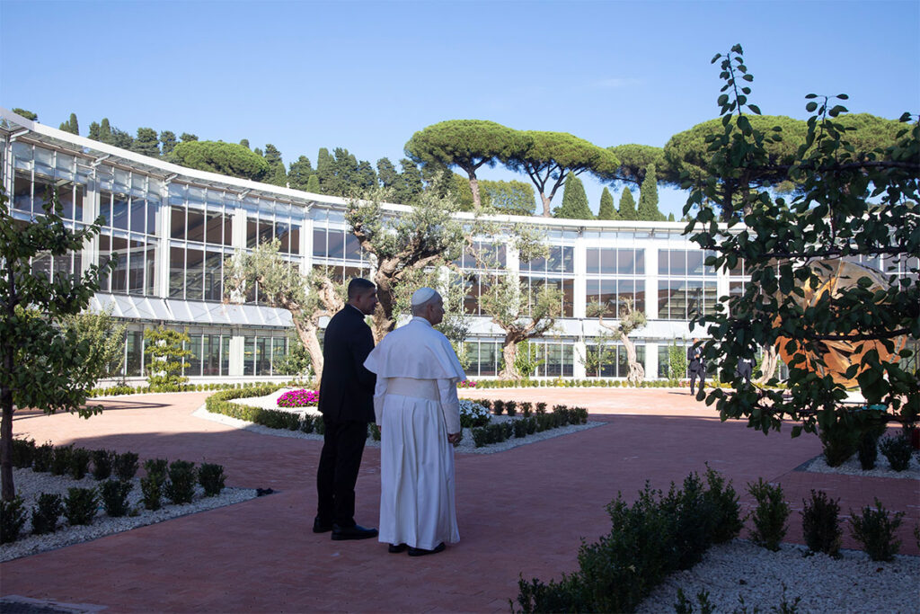 Giunto a Castel Gandolfo alle ore 16 il Santo Padre, prima di presiedere la Liturgia della Parola con il Rito di Benedizione, ha svolto una visita simbolica dei Giardini.